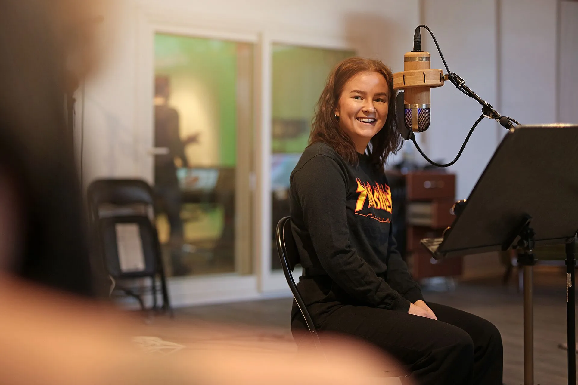 Vi har flere proffe studioer i Mosjøen, og vi skaffer oss tid i studio når vi er klare for det. Du vil få oppleve hvordan man kan spille inn på ulike måter, hvordan en tekniker og produsent tenker og hva du kan forvente deg av en studiosituasjon.